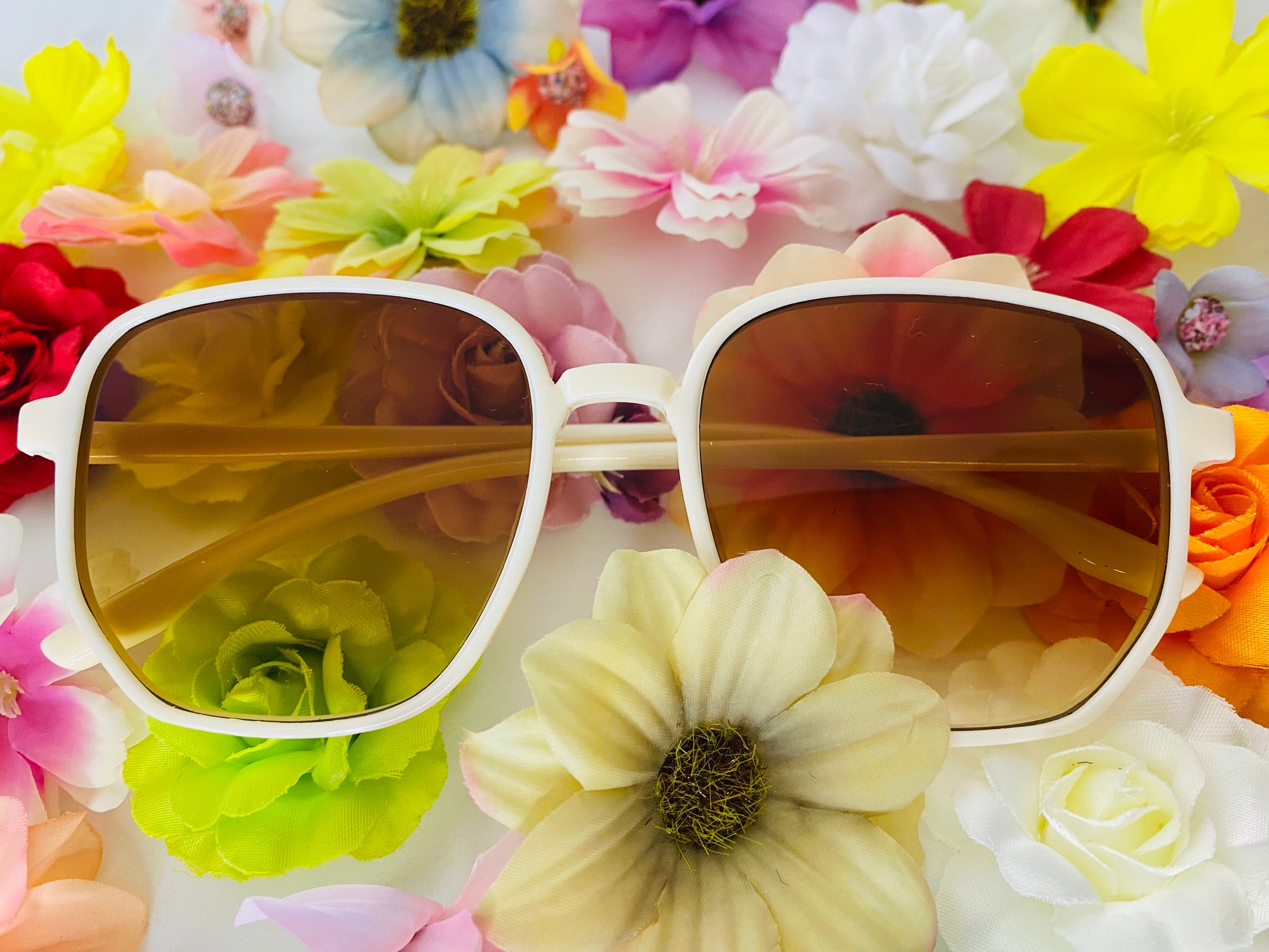 Le cadre beige des lunettes crée un contraste saisissant avec les verres teintés marron. Cette combinaison de couleurs apporte une touche de fraîcheur et de modernité, tout en assurant une légèreté visuelle agréable sous le soleil estival.