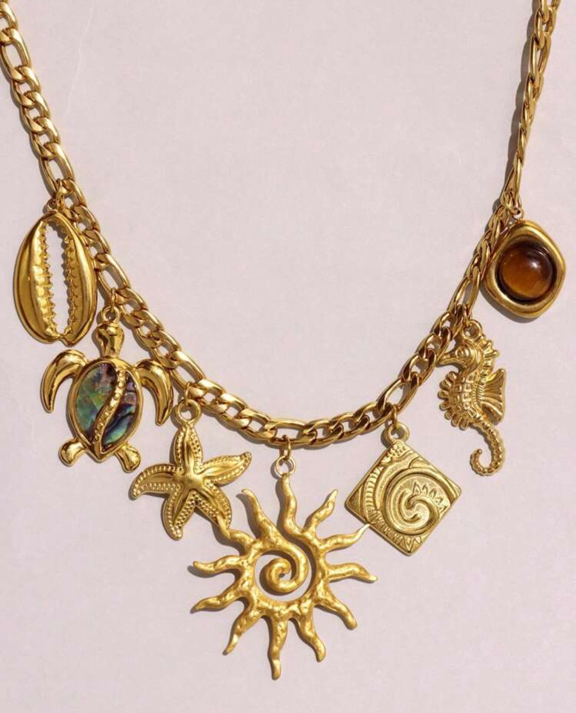 Ajoutez une touche de mer et de soleil à votre collection de bijoux avec notre collier chaîne orné de pendentifs en coquillages et motifs marins diversifiés, parfait pour toute occasion où vous souhaitez briller de mille feux.