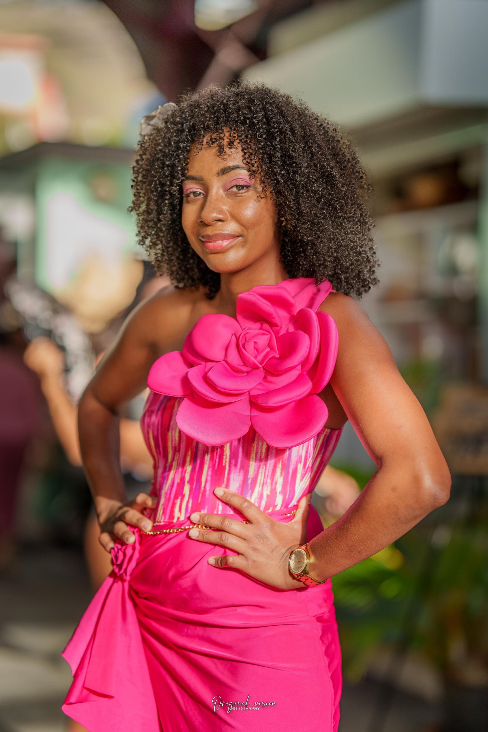 - Décoration : Une grosse fleur rose décorative est fixée à l'épaule. La fleur est faite du même tissu que le maillot, avec des détails en relief pour ajouter du volume et du style.