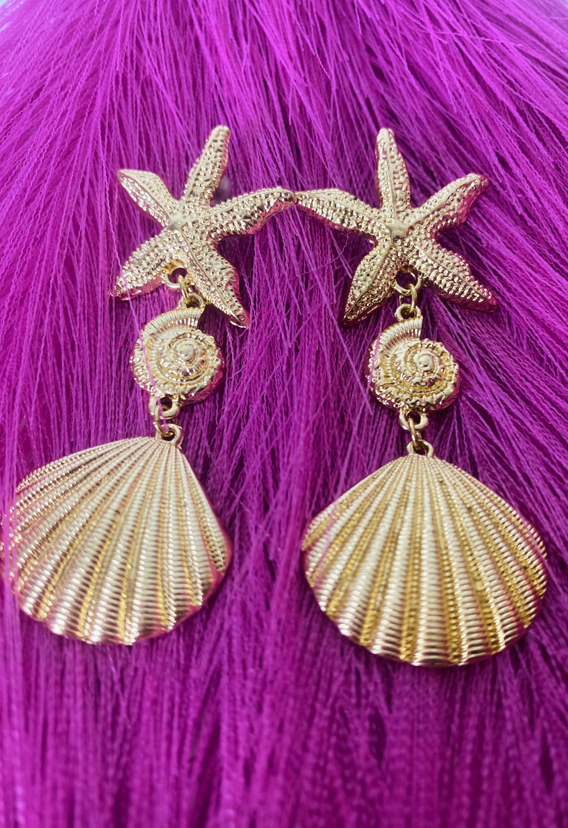 Ces boucles d'oreilles se caractérisent par un magnifique design à trois niveaux. En haut, une étoile de mer délicatement détaillée, suivie de deux coquillages distincts et charmants, créant une harmonie parfaite de la beauté marine.