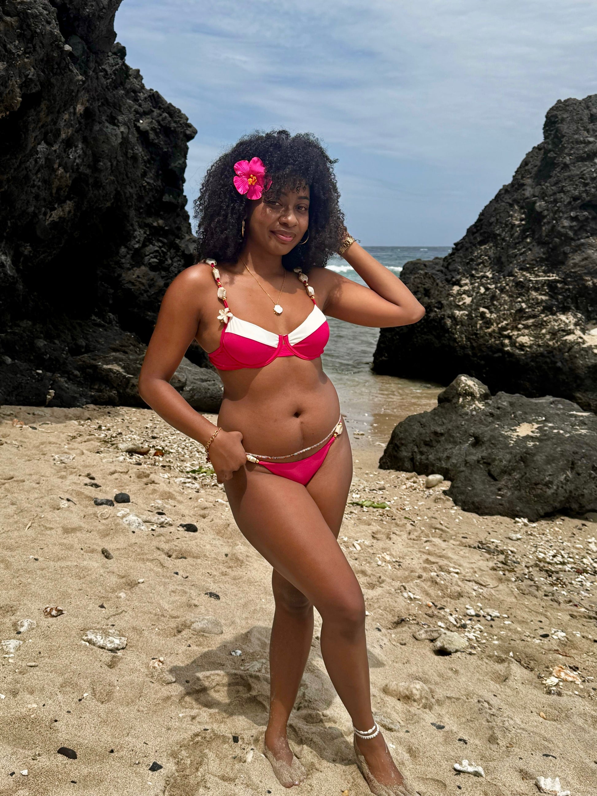 Son design rose vif associé à des touches blanches apporte une allure fraîche et moderne, idéale pour attirer les regards sur la plage comme au bord de la piscine.